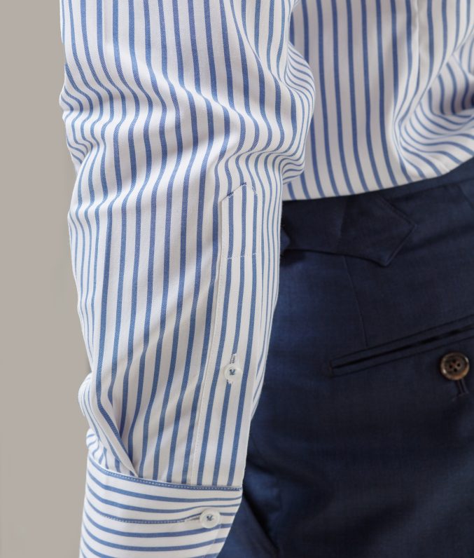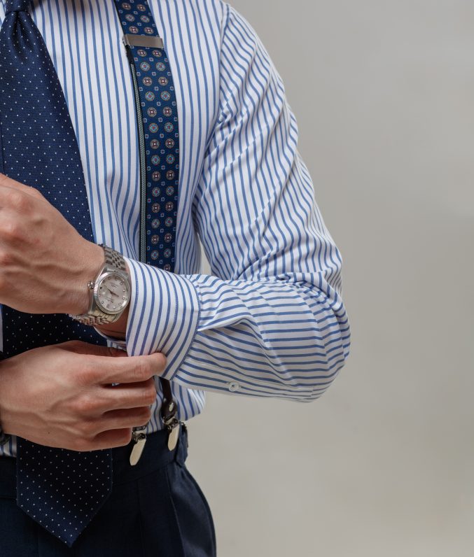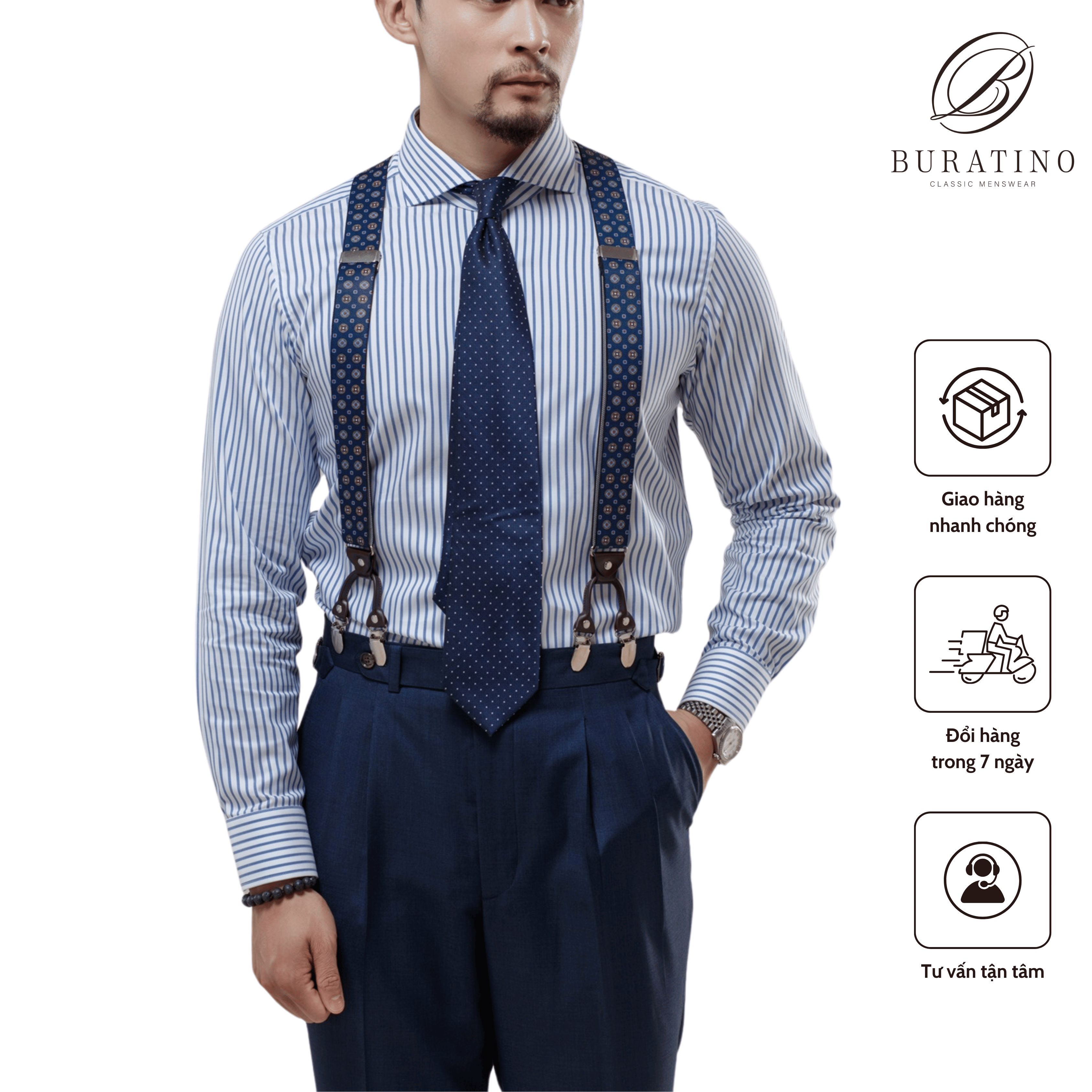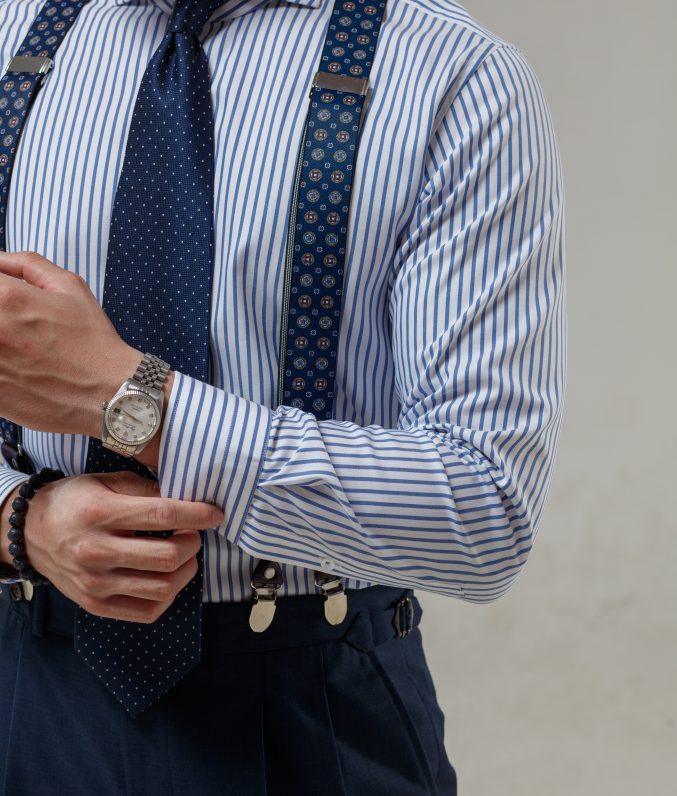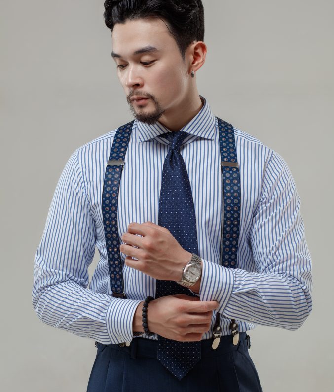 Review Sơ mi trắng cotton kẻ navy/đen cổ Cut away